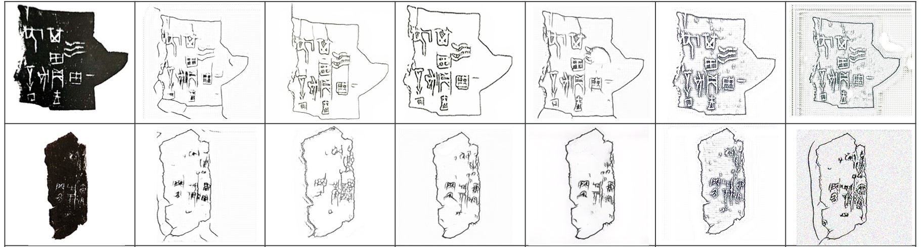 使用预训练+精训练两步走的方式充分利用数据训练,研制出首个甲骨拓本-摹本风格转换模型,判别器模型准确率达到99.90%,实现高质量的甲骨拓本-摹本转换;