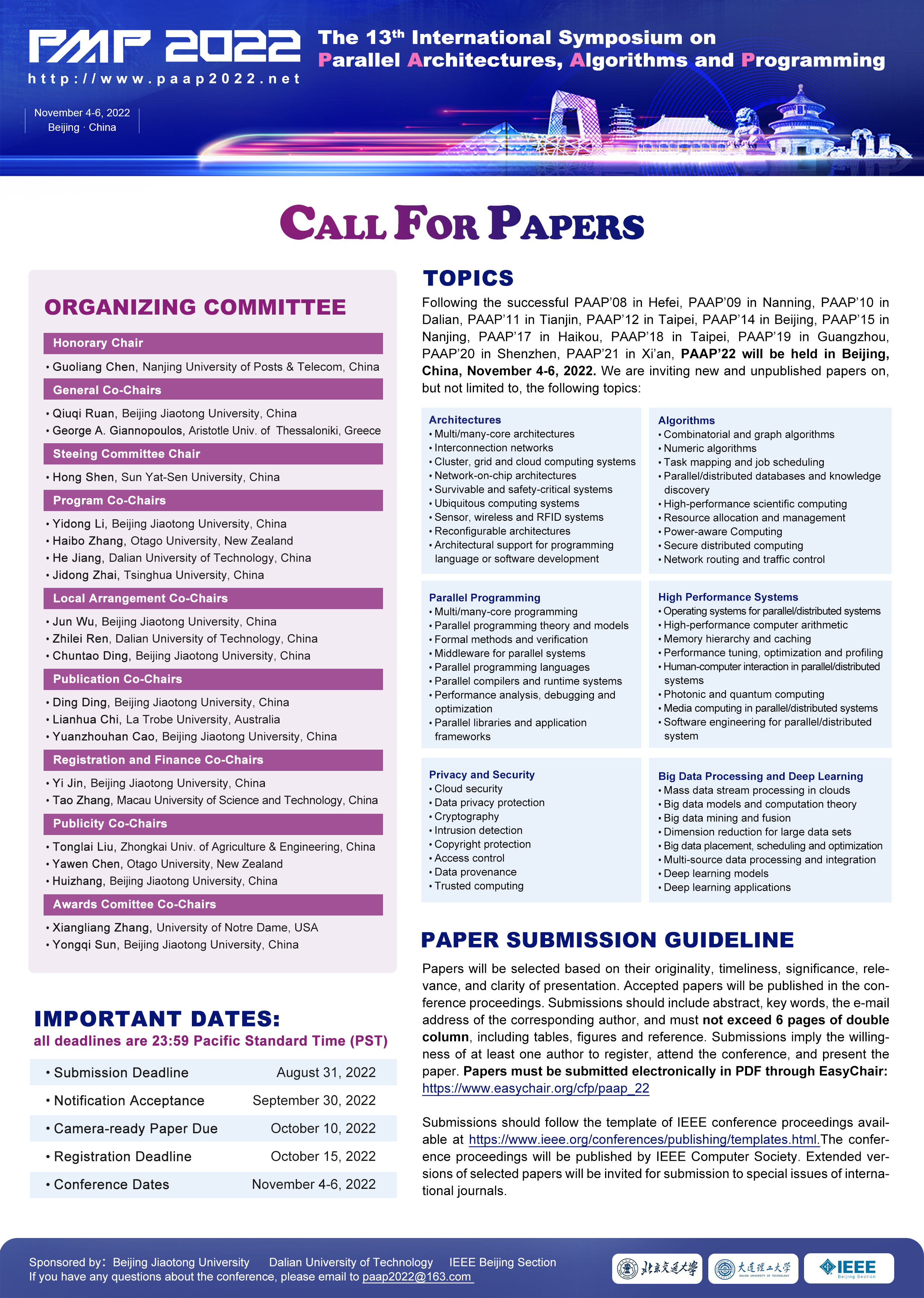 2022年第13届并行结构、算法与程序设计国际会议(PAAP 2022)将于2022年11月在中国北京召开,此次大会由太阳成官网计算机与信息技术学院主办。大会致力于为学术界和工业界的科学家和工程师提供一个论坛,展示他们在并行结构、算法与程序设计各方面的研究成果和开发活动。欢迎各位老师和同学踊跃投稿、参会,共同探讨、交流相关领域的最新研究进展及面临的机遇与挑战。