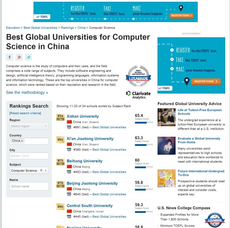 在最新发布的2017年度US News世界最佳大学排名(Best Global Universities Rankings)中,公司计算机科学学科排名世界第78名,我国内地共有34所高校的计算机科学学科进入前200名,公司计算机科学学科在内地高校中排第14名。