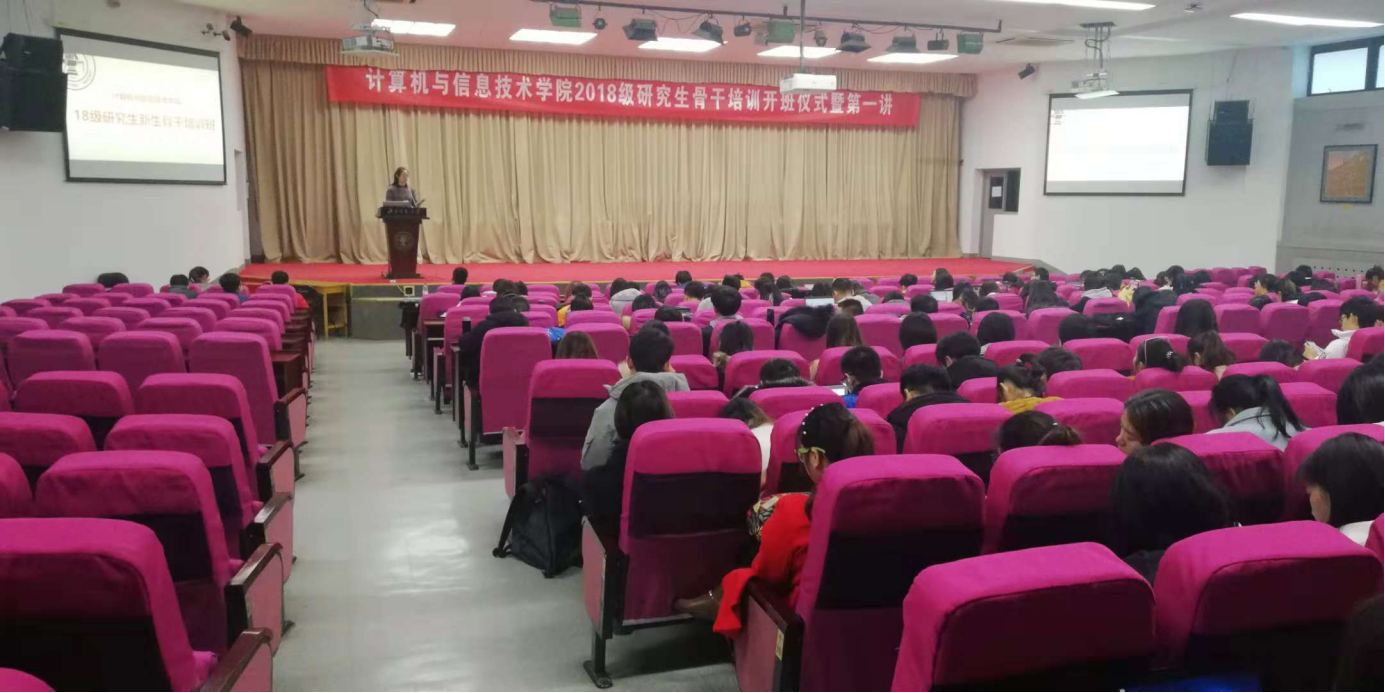 2018年11月30日,计算机与信息技术学院2018级研究生骨干培训班开班仪式暨第一讲在中心报告厅召开。公司党委书记杨晓晖、校研究生工作部副部长郭祎华、兼职辅导员董瑞、研究生各年级兼职辅导员以及2018级研究生骨干和党员同学们参加了会议。