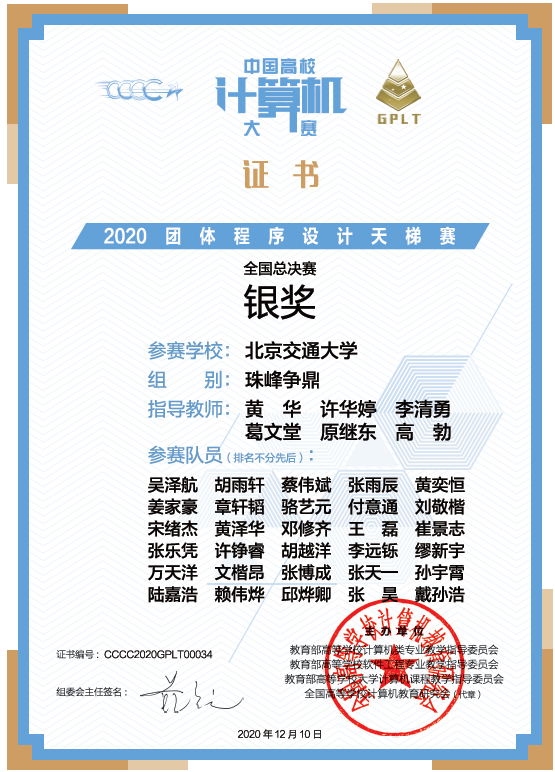 第五届中国高校计算机大赛-团体程序设计天梯赛于2020年11 月28日举行,来自全国29个省级行政区的298所高校组成的935支队伍计9300位员工参赛,公司组织了30名同学组成三支队伍参赛。经过长达3小时的激烈角逐,最终斩获全国总决赛银奖。