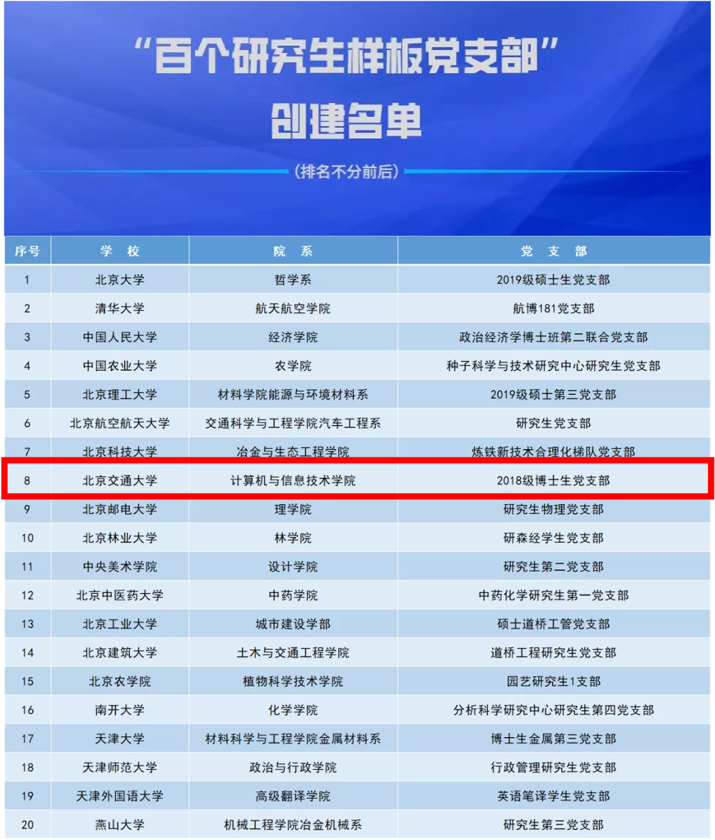 计算机与信息技术学院2018级博士生党支部成立于2018年9月,现有正式党员28人,预备党员6人,占班级人数的71.4%。支部依托计算机科学与技术学科(第四轮学科评估A-类学科)建设,成立以来党支部坚持旗帜鲜明讲政治,推动“党团班舍”协同前进,促进“党建引领科研”创新发展,打造充满“合力、活力、效力、实力”的博士生党支部。