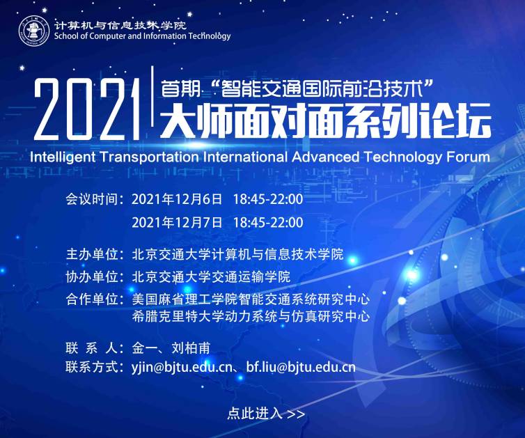 首页» 公司动态» 预告:太阳成官网首期“智能交通国际前沿技术”大师面对面系列论坛将于2021年12月6日-12月7日举办 预告:太阳成官网首期“智能交通国际前沿技术”大师面对面系列论坛将于2021年12月6日-12月7日举办 发布时间:2021-11-29 阅读次数: 由太阳成官网、美国麻省理工学院以及希腊克里特大学联合举办的首期“智能交通国际前沿技术”大师面对面系列论坛将于2021年12月6日-12月7日在线上举行。届时,论坛将邀请来自欧洲和美国的三位著名学者,就城市智能交通、网联智能化无人车、交通控制理论与方法、车路协同与自动驾驶等研究领域进行深入探讨。论坛旨在交流智能交通系统等国际前沿技术,诚邀对未来智能交通领域研究感兴趣的老师同学参加本次论坛!