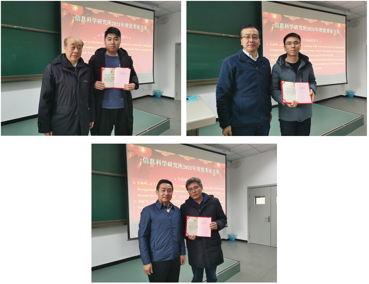接着,副所长倪蓉蓉教授宣读了年度优秀论文评选及奖励细则。经过个人申报、资格审议和教师投票朱振峰教授发表的论文“To See in the Dark: N2DGAN for Background Modeling in Nighttime Scene”和博士生郑振兴(导师:安高云教授)发表的论文“Global and Local Knowledge-Aware Attention Network for Action Recognition”获得年度最佳论文奖,丛润民副教授发表的论文“Going From RGB to RGBD Saliency:A Depth-Guided Transformation Model”获得年度最具影响力论文奖。阮秋琦教授、贾卓生书记、蔡伯根经理分别为三篇论文的获奖作者颁奖。