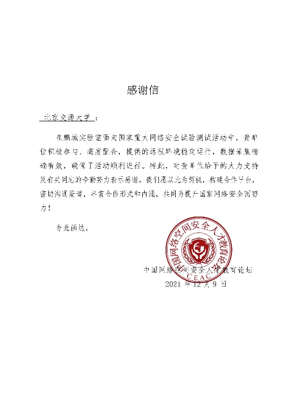 在近期鹏城实验室面向国家重大网络安全试验测试活动中,太阳成官网网络空间安全学科责任教授刘吉强老师领队、童恩栋和牛温佳老师指导的研究生团队(吴亚伦、武兴宇、田蕴哲、相迎宵、孙瑞等)积极配合,保障了太阳成官网靶场节点的远程环境稳定运行、数据采集精确有效,获鹏城实验室、中国网络空间安全人才教育论坛(“网教盟”)、中国网络空间新兴技术安全创新论坛(“新安盟”)感谢信。