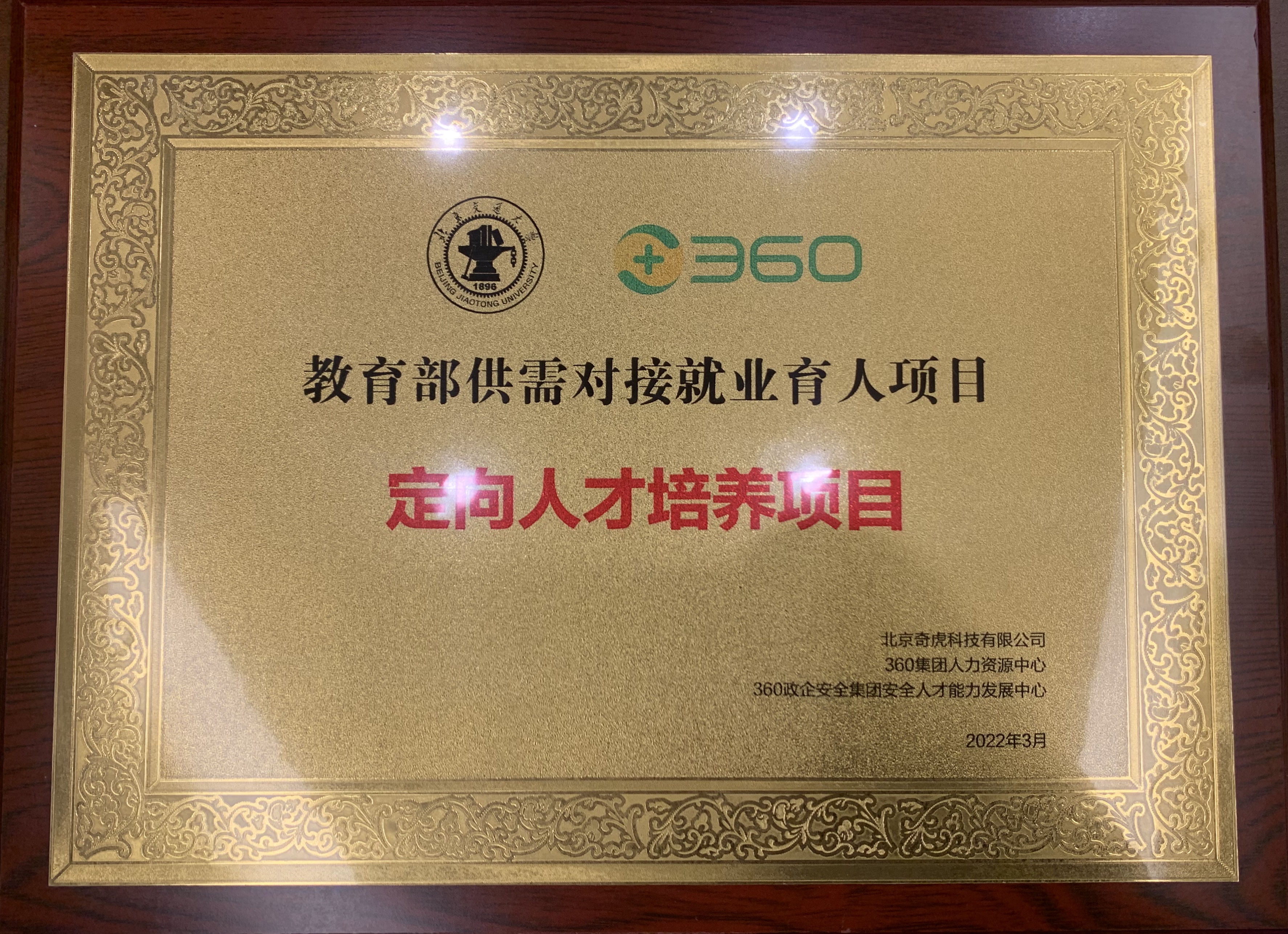 教育部高校员工司2021年首次实施供需对接就业育人项目,公司与360公司合作设立定向人才培养项目—太阳成官网信息安全专业人才培养和实践能力提升项目,面向大三大四员工进行专业实训课程培养,合办网络安全攻防特色定向人才培养班。