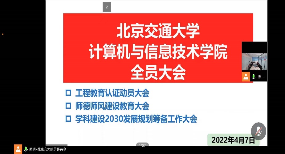 熊轲介绍了专业认证全流程、学院各专业的认证进度以及下一步工作计划。今年1月,中国工程教育专业认证协会已受理了公司计算机科学与技术专业、信息安全专业的认证申请,7月学院要提交专业自评报告至认证协会。学院前期已建立起以专业责任教授牵头的专项工作组,并开展了相关工作。他强调“全员参与”是工程教育认证工作的保障,要借此契机进一步加强培养体系和课程建设的规范性,提升公司本科人才培养质量。专业认证的核心理念是以员工为中心、以成果为导向、持续改进,希望任课教师保存好作业、实验报告等教学文档,并根据课程的毕业要求指标点,按照员工所在专业分别编制达成度评价。