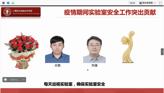 景丽萍副经理在会议上宣读了学院安全管理责任书内容,要求全体员工提高政治站位,强化安全红线意识,深刻认识实验室安全工作的重要性。并对近期检查发现的安全隐患问题进行了警示通报。最后对在疫情封校期间积极承担学院实验室安全巡视的吕凯、刘强两位老师表达了真诚谢意。