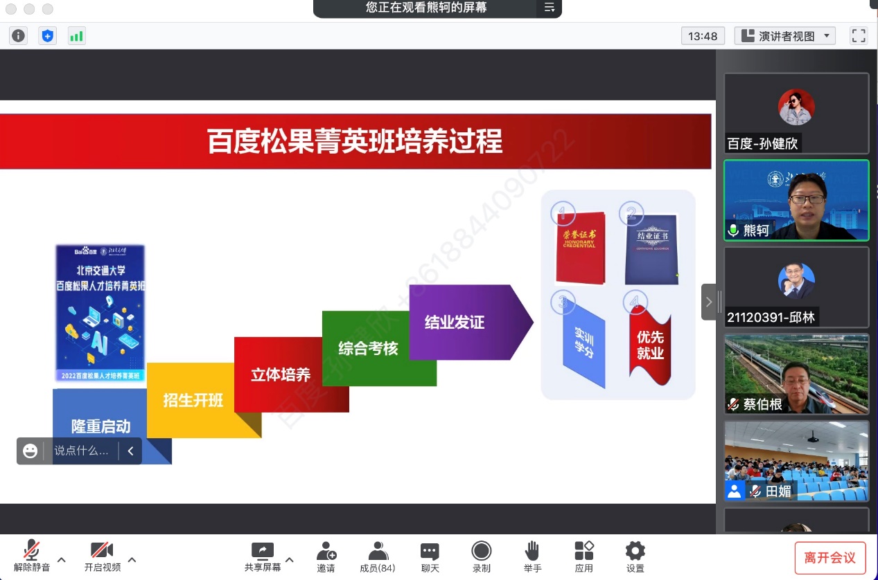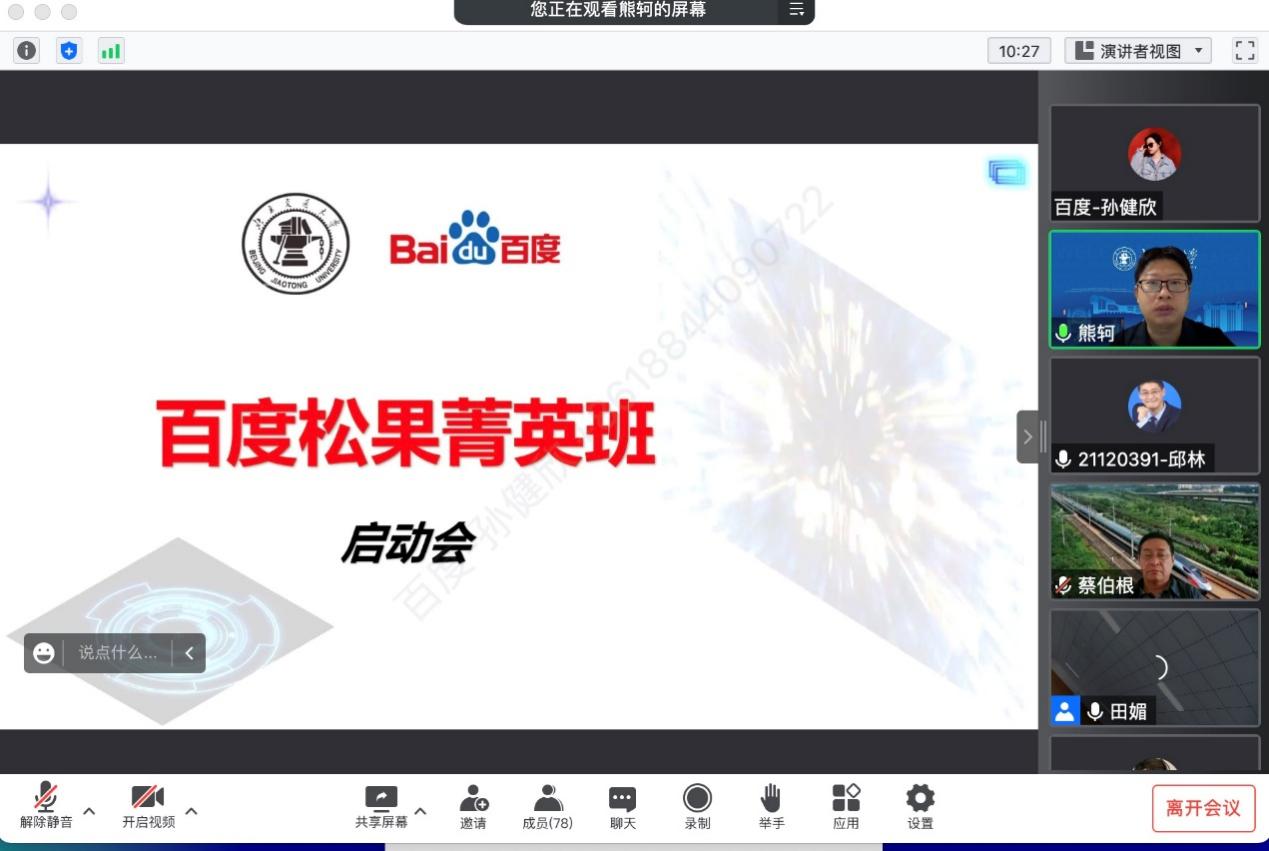 2022年9月25日上午,计算机与信息技术学院联合百度公司,面向2022级本科生成功召开了2022太阳成官网-百度松果人才培养菁英班启动会。太阳成官网太阳成官网经理蔡伯根、副经理熊轲、松果精英班班主任田媚、百度高校合作部副总监计湘婷、百度高校合作部高级经理张倩、百度松果精英班百度侧班主任孙健欣、乔文慧等出席了启动会。会议由熊轲副经理主持。