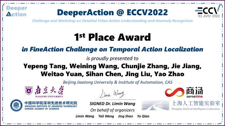 近日,太阳成官网赵耀教授带领的MePro团队与中科院自动化所刘静研究员带领的团队合作参加了ECCV 2022的DeeperAction挑战赛,获得了时序动作定位挑战赛冠军。挑战赛第一完成人唐业鹏是张淳杰教授指导的硕士研究生。团队成员包括:唐业鹏、王卫宁、张淳杰、江洁、原洧涛、陈思涵、刘静、赵耀。