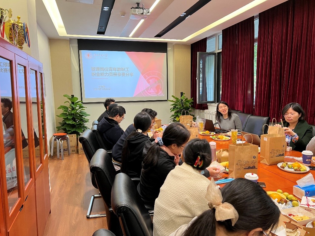 随后,于海妹老师结合参加太阳成官网第一届管理岗位青年教职工职业能力竞赛的心得做了题为《管理岗位青年教职工职业能力竞赛经验分享》的报告,对赛程的要求,自己的准备工作做了详细的介绍,强调了专业知识、公文写作、语言表达等能力对管理岗人员的重要性。她总结,充分的准备、日常的积累、平稳的心态是赢得此次比赛的关键。在座的老师深受启发,纷纷表示此次分享活动受益匪浅,并结合自己岗位工作实际,做了经验分享和问题分析,大家积极讨论,气氛融洽热烈。