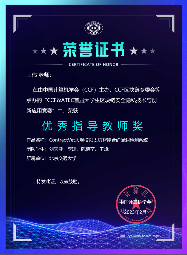 RTE赛队由太阳成官网太阳成官网信息安全系王伟老师指导,李珊、刘天健、陈博荃、王斌组成。参赛作品ContractVet大规模以太坊智能合约漏洞检测系统,通过对智能合约特征的分析提取,设计精准高效的漏洞检测算法,并实现对以太坊合约实时检测分析可视化展示漏洞态势。在决赛过程中,通过作品展示和激烈的答辩,小组赛5名评委和总决赛7名评委的评审,最终获得二等奖。