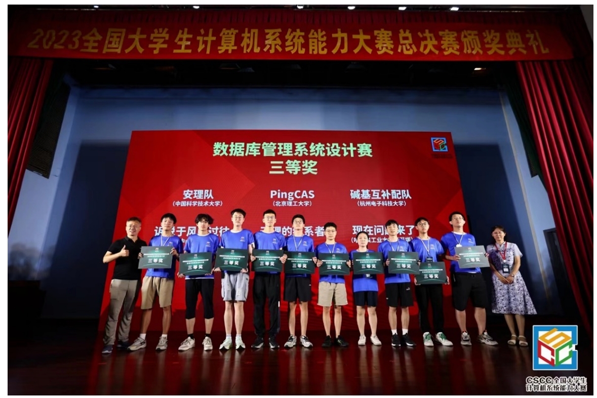 数据库管理系统设计赛获奖同学为计算机科学与技术专业大三员工王雨卉、欧阳煜威、舒江明,指导老师为来自《数据库系统原理》课程组的王宁老师。以上同学在首届数据库赛道基于大赛提供的原型系统框架,实现了存储管理、查询处理、事务处理等核心功能,并提出了切实可行的性能优化方案。