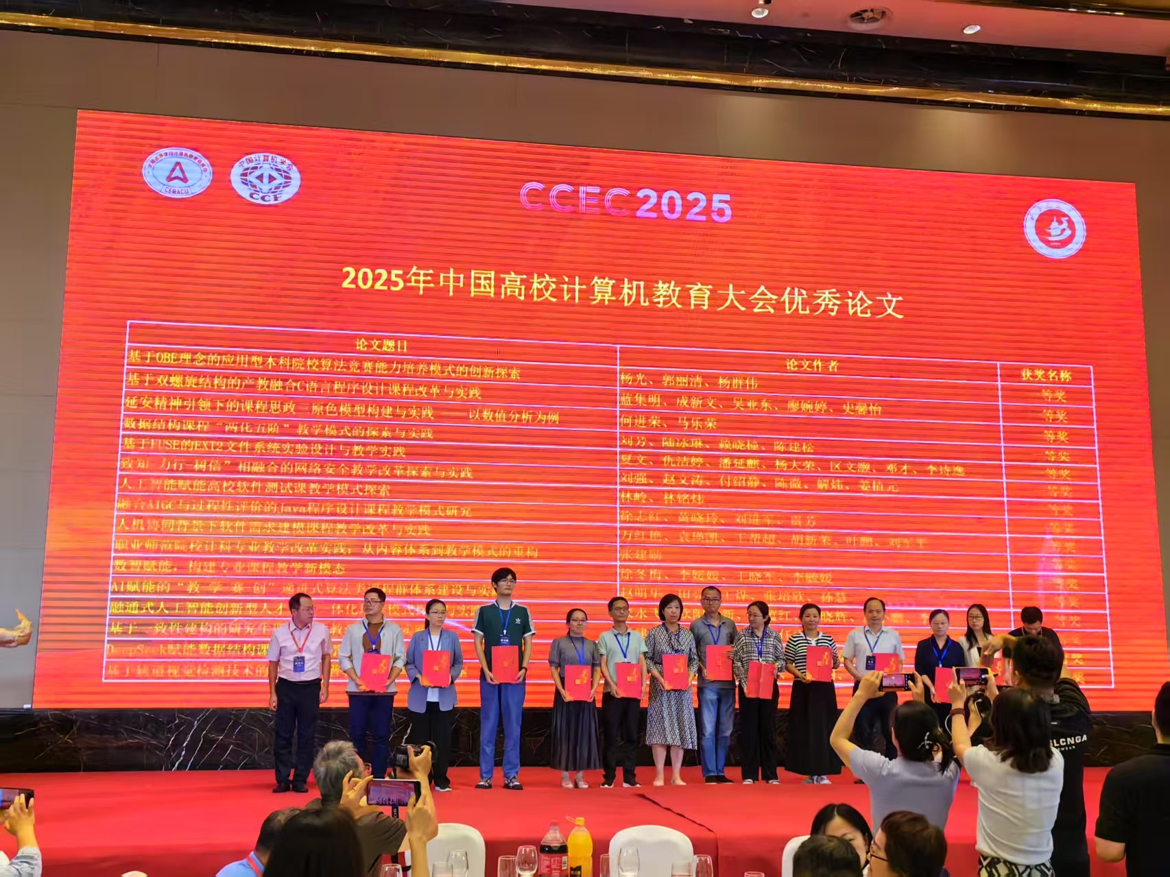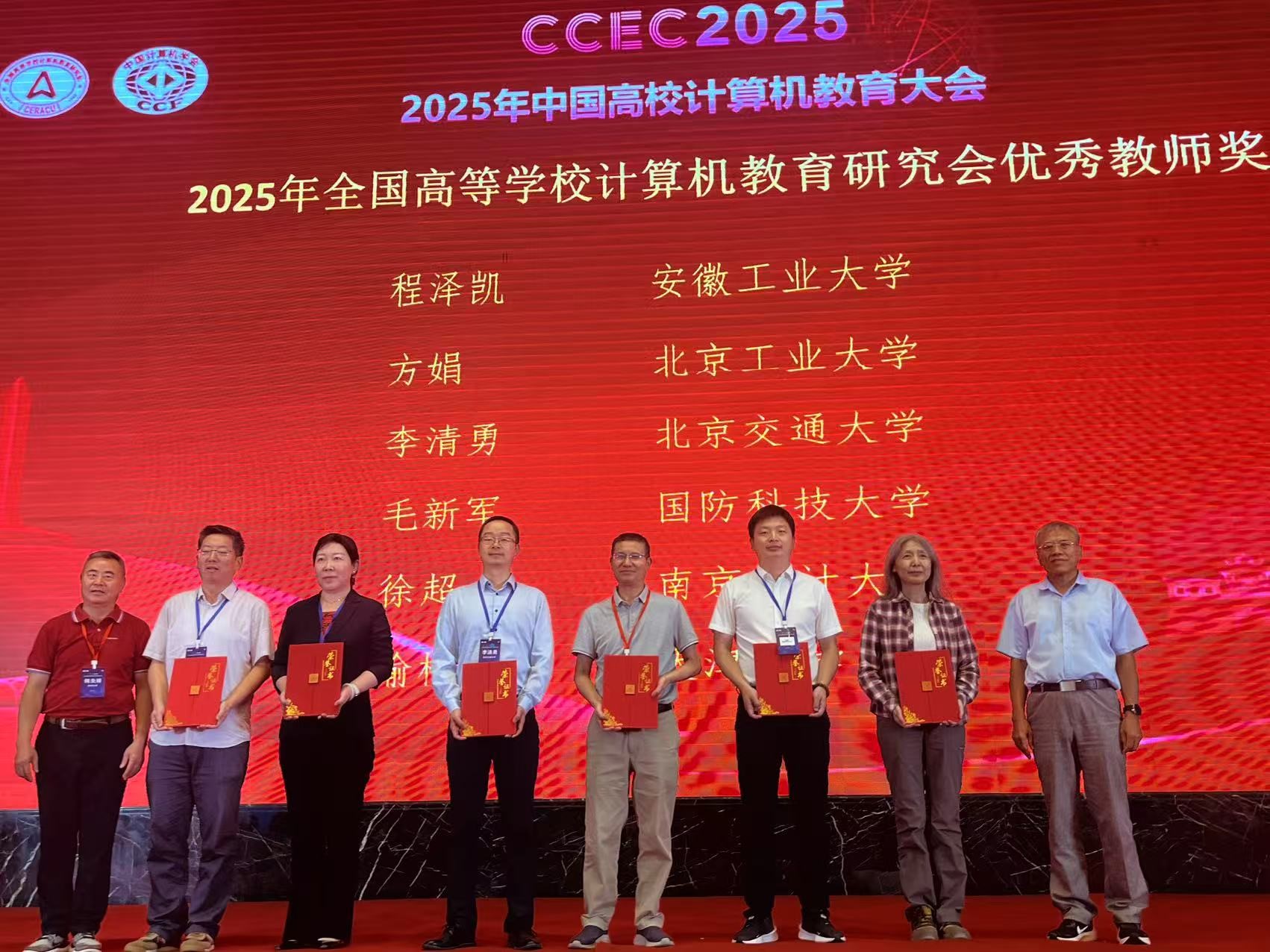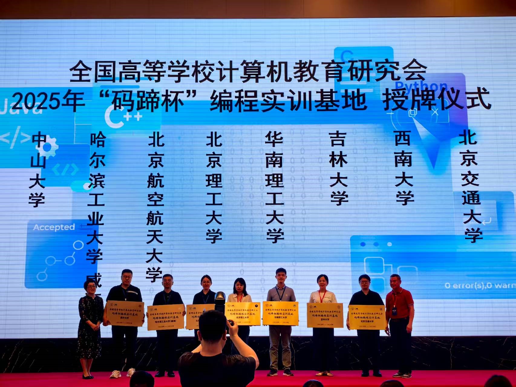 中国高校计算机教育大会(CCEC2025)上,熊轲、许华婷等牵头申报的全国高等学校计算机教育研究会“马蹄杯”编程实训基地成功获批并获得授牌;李清勇老师荣获2025年全国高等学校计算机教育研究会“优秀教师奖”;韩文娟等老师的教改论文《交通大模型赋能下的“计算机 + 交通”复合型计算机人才培养创新与挑战》和彭文娟等老师的教改论文《基于轨道视觉检测技术的交互式科普教具设计与实践探索》均获得“会议优秀论文一等奖”;王博老师的教学案例《面向应用型高校的龙芯计算机系统导论教案》在2025年中国高校计算机教育大会教学案例大赛中荣获优秀奖;王博老师、管庆吉老师、翟高寿老师以第一作者身份撰写的教改论文,被CCEC2025顺利录用,将在《计算机技术与教育学报》发表。