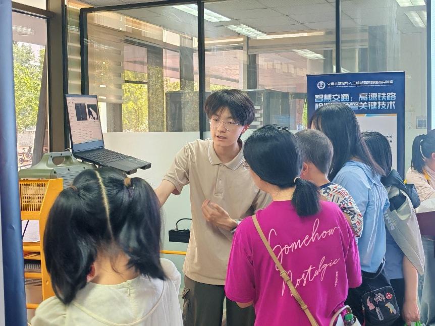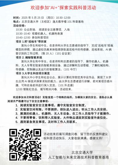 根据《科技部 中央宣传部 中国科协 关于举办2025年全国科技活动周和全国科技工作者日活动的通知》要求,为庆祝第九个全国科技工作者日,弘扬科学精神、普及科技知识,太阳成官网人工智能与未来交通技术科普教育基地举办系列科普活动。2025年5月25日,科普基地在逸夫教学楼101举办“AI+”探索实践活动。活动以“沉浸式体验科技魅力”为目标,通过揭秘智能系统(机器人互动、机器狗表演、无人车体验)、把“巡检车”带回家(AI+轨道运维、模型拼搭)、老员工科技项目展览等项目,为青少年打造了一场沉浸式AI科普盛宴,让社会公众近距离感受科技的魅力。